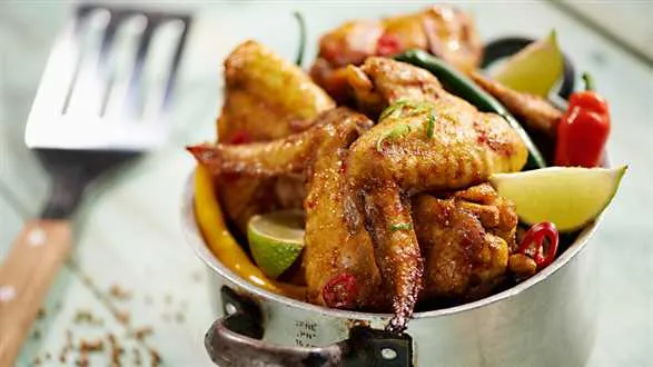 Złociste skrzydełka z kurczaka przygotowane w orientalnej marynacie na bazie limonki, imbiru oraz papryczek chili.