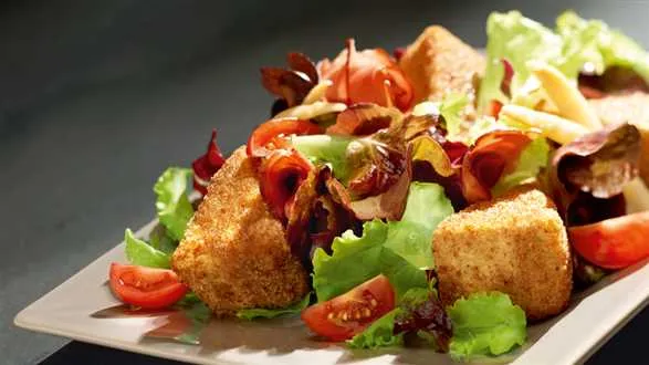 Najsłynniejszy francuski ser panierowany w orzechach, migdałach i korzennych ciastkach, podawany z orzeźwiającą sałatką.