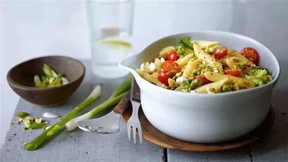Sałatka z warzywami i makaronem z sosem pistacjowym • przepis • składniki • przygotowanie